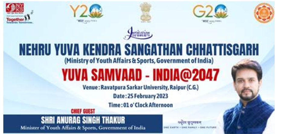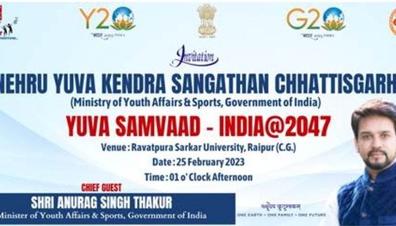 नई दिल्ली ।नेहरू युवा केंद्र संगठन छत्तीसगढ़ (युवा कार्यक्रम खेल मंत्रालय , भारत सरकार) द्वारा युवा संवाद तथा Y20 कार्यक्रम का आयोजन रावतपूरा सरकार विश्वविद्यालय , रायपुर में दिनांक 25 फरवरी 2023 को युवा कार्यक्रम एवं खेल मंत्री , भारत सरकार श्री अनुराग ठाकुर जी के मुख्य आतिथ्य और रायपुर सांसद सुनील सोनी , पद्मश्री अजय मंडवी, पद्मश्री फूलबासन बाई के विशिष्ट आथित्य में होगा ।