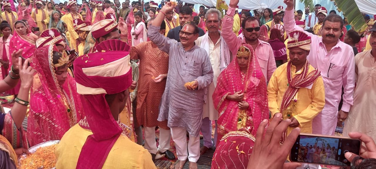 मैत्री भवन में आयोजित कन्या विवाह में सभी रस्म पं कृपालनाथ तिवारी द्वारा विधि विधान से कराए गए।शादी समारोह की शुरुआत दीप प्रज्वलन और छत्तीसगढ़ महतारी के छायाचित्र पर माल्यार्पण व राजगीत के साथ हुई जिसके बाद अतिथियों का स्वागत किया गया।डॉ प्रेमसाय सिंह में साथ अन्य अतिथि वर वधू माला कार्यकम में शामिल हुए और पुष्पवर्षा व अक्षत के साथ आशीर्वाद दिया।अपने हाथों से उन्होंने वर वधु को उपहार भेंट किये।इस दौरान डॉ प्रेमसाय सिंह ने सभी वर वधुओं से कहा कि नए जीवन में साथ साथ चलने के लिए एक पवित्र बंधन में बंध रहे हैं,आप सभी को नवदाम्पत्य जीवन की बधाई।उन्होंने कहा कि छत्तीसगढ़ सरकार की मुख्यमंत्री कन्या विवाह शासन की बहुत अच्छी योजना है, गरीब परिवारों के लिए यह बहुत ही सहयोगी है। इससे गरीब परिवारों के बच्चों की शादी संपन्न कराने में मदद मिलती है,साथ ही इस विवाह कार्यक्रम में शामिल छोटे-बड़े सभी लोगों का आशीर्वाद भी मिलता है। प्रदेश के ऐसे गरीब माता-पिता जिनकी आर्थिक स्थिति इतनी अच्छी नहीं है, वे अपने बच्चों की शादी धूमधाम से कर सकें,ऐसे माता-पिता के लिए मुख्यमंत्री कन्या विवाह योजना कारगर सिद्ध हो रही है। इस योजना से प्रतापपुर क्षेत्र की बेटियों के हाथ पीले होने के साथ-साथ प्रदेश के हजारों बेटियों के हाथ भी पीले हुए हैं और वे सुखमय जीवन जी रही है। छत्तीसगढ़ सरकार ने राज्य में गरीब परिवारों को उनकी बेटियों की शादी में पड़ने वाले बोझ को कम करने के लिए मुख्यमंत्री कन्या विवाह योजना पूरे राज्य में चलाई हुई है। इसके तहत वह गरीब परिवार जो पैसे की कमी की वजह से अपनी बेटियों की शादी नहीं कर पाते है वह सभी सरकार द्वारा दी जाने वाली वित्तीय सहायता का लाभ उठा सकते हैं।उन्होंने धान खरीदी,पत्रकार सुरक्षा ,स्कूल शिक्षा का जिक्र करते हुए कहा कि हमारी सरकार सभी का ध्यान रख रही है।उन्होंने शासन की विभिन्न योजनाओं का जिक्र भी किया।स्वागत उद्बोधन में जिला कार्यक्रम अधिकारी चंद्रवेश सिसोदिया ने कहा कि सूरजपुर जिले में अब तक 363 शादियां हो गई हैं जो लक्ष्य से ज्यादा हैं।उन्होंने शासन की मुख्यमंत्री कन्या विवाह योजना के उद्देश्य और इसके लाभ की जानकारी दी।मंच संचालन बाल संरक्षण अधिकारी मनोज जायसवाल तथा आभार इमरान अख्तर सीडीपीओ भैयाथान ने किया।इस दौरान पार्षद निशा बीजू दासन,एसडीएम दीपिका नेताम, नायब तहसीलदार तेज यादव,जनपद सीईओ निजामुद्दीन, बीईओ एमएस धुर्वे,प्रभारी परियोजना अधिकारी प्रतापपुर सुन्दरमती बघेल,रामानुजनगर अमृता भगत,ओड़गी मीरा कुरील,सूरजपुर वर्षा अग्रवाल,सिलफिली बेरथा तिर्की,सुरेंद्र राजवाड़े अधीक्षक,नीलेश गोस्वामी,दीपंक सिंह, ब्रिजभुवन गिरी, रामसुमेर मिश्रा,रोशन आनंद झा,