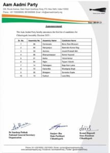 अफरोज खान। छत्तीसगढ़ में आगामी विधानसभा चुनाव के लिए आम आदमी पार्टी ने प्रत्याशियों की पहली लिस्ट जारी कर दी है। पार्टी ने अपनी पहली लिस्ट में 10 सीटों से उम्मीदवारों की सूची जारी है। ये है आप उम्मीदवारो की सूची।