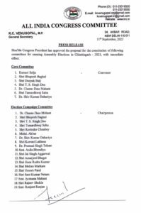 कांग्रेस ने छत्तीसगढ चुनाव हेतु कोर कमेटी,कैंपेन कमिटी, कम्युनिकेशन कमेटी और प्रोटोकॉल कमेटी का गठन किया।