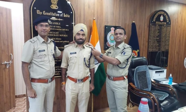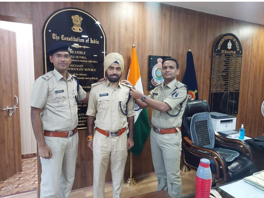 इसी क्रम में मंगलवार को पुलिस अधीक्षक सूरजपुर आई कल्याण एलिसेला व एएसपी शोभराज अग्रवाल द्वारा पदोन्नत हुए अमोलक सिंह ढिल्लो के कंधे पर अशोक स्तंभ लगाकर पदोन्नति की बधाई दी।