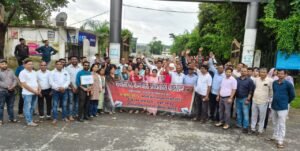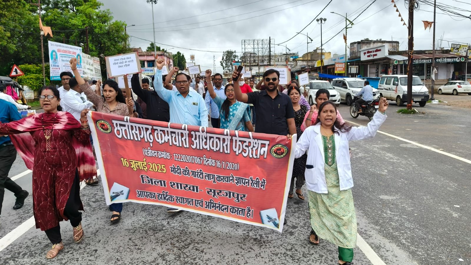 अनुकंपा नियुक्ति नियमों में 10 प्रतिशत सीलिंग में शिथिलीकरण की जाए। प्रदेश में कैशलेश सुविधा लागू की जाए। अर्जित अवकाश नगदीकरण 300 दिवस की जाए। दैनिक, अनियमित, संविदा कर्मचारियों को नियमित करने की ठोस नीति बने। सभी विभागों में सेवानिवृत्त आयु 65 वर्ष की जाए। जिला संयोजक ने आगे बताया कि आज उक्त मांगों के निराकरण के लिए सरकार को ध्यानाकर्षण कराया गया है, यदि जल्द ही इस पर विचार नहीं किया गया तो आगामी 22 अगस्त को पूरे प्रदेश में तालाबंदी कर वृहद आंदोलन किया जाएगा। जिला संयोजक ने कर्मचारी अधिकारियों से अपने हक अधिकार की लड़ाई को मजबूती देने की अपील की है। वहीं, जिला संयोजक महिला प्रकोष्ठ ने बताया कि प्रदेश में लगातार कर्मचारियों की मांगों की उपेक्षा हो रही है। समय-समय पर महंगाई भत्ता जैसे मुद्दे पर भी आंदोलन करना पड़ रहा है। पूरे प्रदेश में मोदी की गारंटी देकर पूरा न करना कहीं न कहीं मोदी जी का नाम बदनाम हो रहा है।हम शासन से मांग करते हैं कि प्रदेश में मोदी जी की गारंटी के तहत किये गए वादों को जल्द से जल्द पूरा करे। जिला महासचिव मो.इकबाल अंसारी ने कहा कि आज पूरे देश मोदी जी जो कहते हैं वो पूरा करते हैं, इसका तत्कालीन उदाहरण ऑपरेशन सिंदूर है जिसमें उन्होंने पाकिस्तान से बदला लेकर अपने वादे को पूरा किया लेकिन छत्तीसगढ़ में उनके नाम का उपयोग कर किये गए वादे को पूरा न करना कहीं कहीं सवालिया निशान पैदा करते हैं।आज के रैली, ज्ञापन कार्यक्रम में जिला संयोजक डॉ आर एस सिंह, डॉ राजेश पैकरा, प्रतिमा सिंह, मो.इकबाल अंसारी, गोपाल विश्वकर्मा, विजय साहू,निर्मल भट्टाचार्य, मनीष दीपक साहू, राजकुमार सिंह, सतीश प्रताप सिंहदेव,आदेश रवि, राधेश्याम साहू,कृपालनाथ तिवारी,महावीर ठाकुर,महेश पैकरा,आदित्य शर्मा,विन्देश गुप्ता,ज्योति साधना, माया शर्मा,अनुरंजन देव,रमेश राजवाड़े, संत राम,रामनंदे साहू,रवि प्रसाद पैकरा,शिव कुमार पैकरा,यशवंत प्रताप सिंह,अवधेश कुमार सिंह ,बसंत पैकरा,विजयनारायण सिंह ,विकास कुशवाहा,सुनील उइके,अर्जुन सिंह,सहित सैकड़ों कर्मचारी अधिकारी उपस्थित थे।