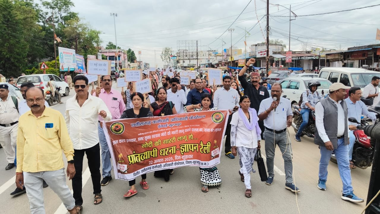 छत्तीसगढ़ कर्मचारी अधिकारी फेडरेशन के आव्हान पर 22 अगस्त को प्रदेशभर में एकजुट होकर सभी कर्मचारी-अधिकारी अपनी 11 सूत्रीय मांगों को लेकर प्रदर्शन किया। यह प्रदर्शन केंद्र सरकार की गारंटी के अनुरूप सुविधाएं लागू करवाने और राज्य सरकार से लंबित मांगों के जल्द निराकरण की मांग को लेकर किया जा रहा है। प्रदेश के विभिन्न संगठनों ने भी फेडरेशन के आंदोलन को पूर्ण समर्थन कर आंदोलन में शामिल हुए। फेडरेशन के जिला संयोजक डॉ आर एस सिंह ने बताया कि यह प्रदर्शन पूर्णतः शांतिपूर्ण व लोकतांत्रिक ढंग से आयोजित किया गया। आज के धरना प्रदर्शन में कर्मचारी अधिकारी का जन सैलाब आना इस बात का सबूत है कि शासन के प्रति सभी में आक्रोश व्याप्त है। सूरजपुर के सुदूर अंचलों से सभी कर्मचारी-अधिकारी की उपस्थिति निश्चित तौर पर शासन को सोचने पर मजबूर कर देगी कि ज्यादा समय तक कर्मचारी अधिकारियों की उपेक्षा नहीं की जा सकती है। फेडरेशन के सभी संगठनों, पदाधिकारियों व कर्मचारियों से इस ऐतिहासिक आंदोलन में भाग लेकर अपने कार्यक्रम को सफल बनाया। फेडरेशन की 11 सूत्रीय मांगें हैं।